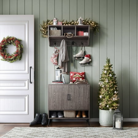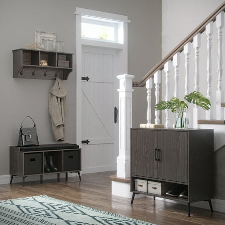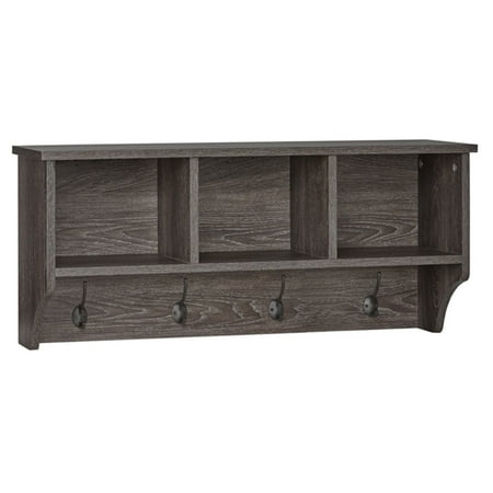 Attractive RiverRidge Woodbury Collection Wall Shelf with Cubbies and Hooks features versatile wood grain texture, adding timeless character to any room. Additional dimensions are: Top Shelf: 31.63”W x 9.38”D, Cubbies: 9.44”W x 8.25”D x 7.25”H, Board with Hooks: 29.5”W x 5.5”H