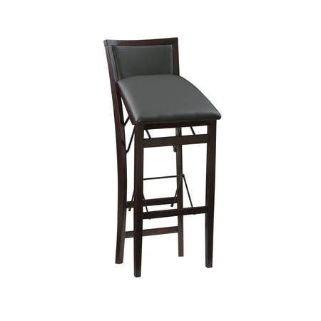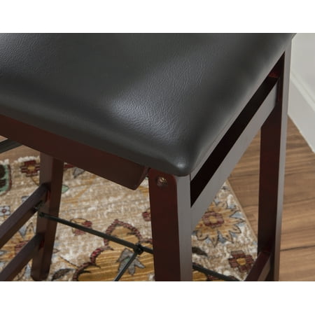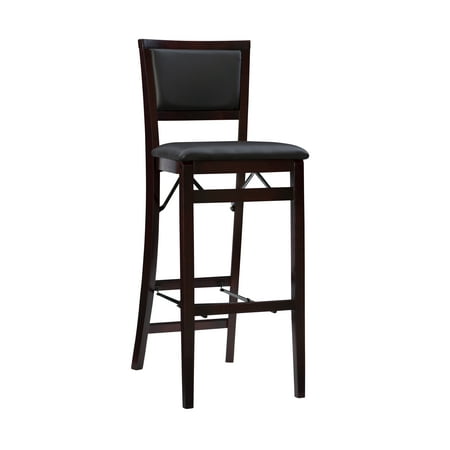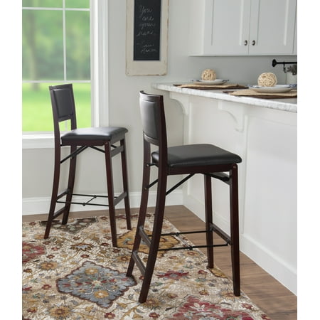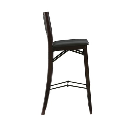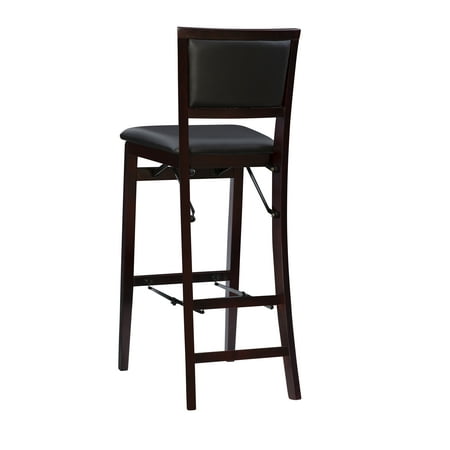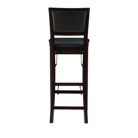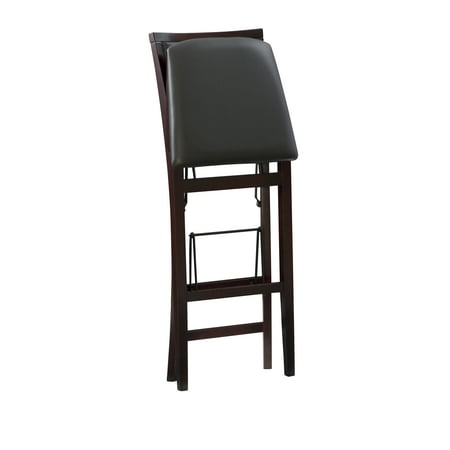 Stylish seating with the convenience of a folding bar stool. This folding stool adds an extra dash of elegance for dining or entertaining. The wood frames feature a classic Padded Back and a wipe clean, vinyl padded seat with the appearance of leather, and a rich Espresso finish. Front and rear supports provide extra stability. The space saving stool fold for easy set up and storage. No assembly required.