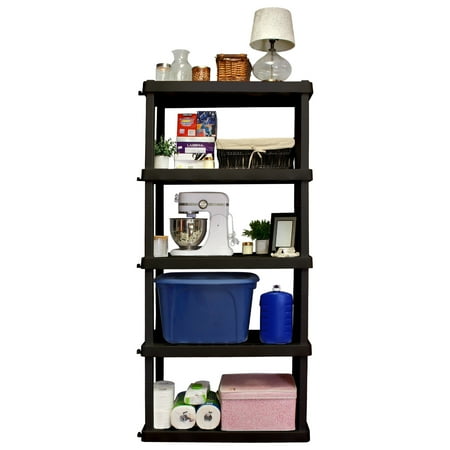 Maximize your storage space with this versatile 5 tier shelving unit, proudly manufactured in North America. Adding shelving is one of the simplest ways to organize even the most limited spaces, protect your items from damp floors, and more. This lightweight unit snaps together with no tools required so you can get started on your home organization project right away. Heavy-duty molded plastic resin shelves hold 150 lbs (68 kg) each and will not rust, dent, stain, or peel. Ventilation holes allow air to flow and control moisture, keeping your items clean and dry. Nested legs and anchor holes offer added support, and the interlocking design lets you easily and securely link together multiple units. Whether you are decluttering your basement, organizing your craft room, or spring cleaning your garage, Hyper Tough has the perfect shelving solution for you.