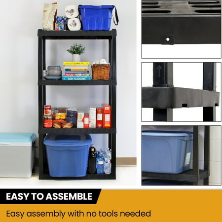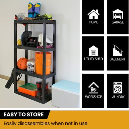 Maximize your storage space with this Shelf Plastic Garage Shelves versatile 4 tier shelving unit, proudly manufactured in North America. Adding shelving is one of the simplest ways to organize even the most limited spaces, protect your items from damp floors, and more. This lightweight unit snaps together with no tools required so you can get started on your home organization project right away. Heavy-duty molded plastic resin shelves hold 150 lbs (68 kg) each and will not rust, dent, stain, or peel. Ventilation holes allow air to flow and control moisture, keeping your items clean and dry. Nested legs and anchor holes offer added support, and the interlocking design lets you easily and securely link together multiple units. Whether you are decluttering your basement, organizing your craft room, or spring cleaning your garage, Hyper Tough has the perfect shelving solution for you.