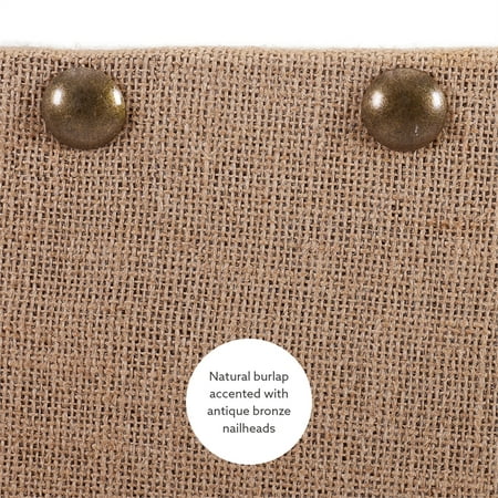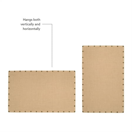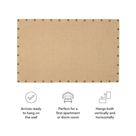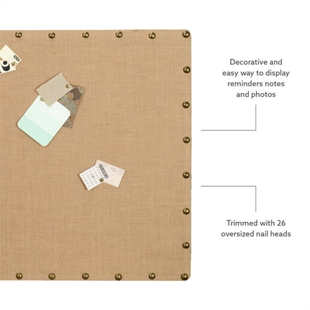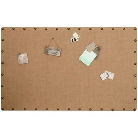 Ideal for placing in an office, kitchen or entry, the burlap bulletin board is perfect for creating a note and message taking space in your home. The burlap covered fiberboard and mdf is accented with oversized antique bronze nail heads. Easily hands vertically or horizontally. Measures 34"x55" Features : Crafted from Burlap, Fiberboard, MDF, Kraft Paper and Nailheads Natural Brown 100% Burlap Perfect for an office, kitchen or entry. Measures 34"x55" Burlap Covered Fiberboard and MDF Antique Bronze Oversized Nailhead Trim (38 Nailheads) Hangs vertically or horizontally. Excellent for a first apartment or dorm room Specifications : Assembly Required : Fully Assembled Product Dimensions : 34"w x 0.71"d x 55"h Product Weight : 15 lbs