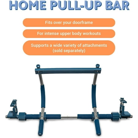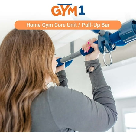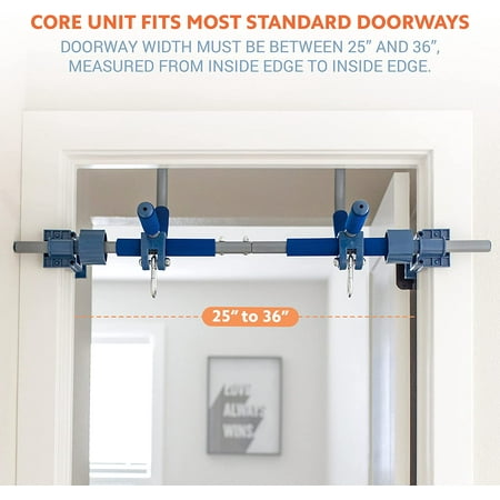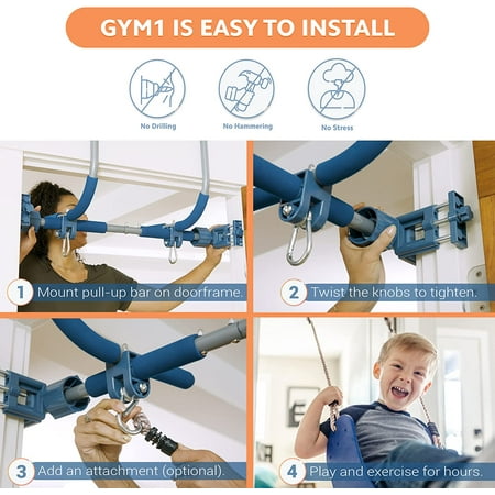 Set up your own home gym in minutes, with Gym1. The pull-up bar unit mounts easily above any interior doorway and can be used for chest, back and shoulder workouts, as well as hanging ab crunches for core strength training. Gym1 attaches to your doorframe without any drilling or hammering. The patented vise-grips adjust to fit your doorway, making this home exercise bar sturdy enough for pull-up exercises and suitable for use with hanging attachments, such as a sensory swing. The Gym1 is safety tested and certified to ASTM and EN International Standards for home playground equipment. Made of professional grade steel, it won't bend or break, and it features six cushioned grips that prevent slipping and callous formation. Though Gym1 itself weighs only 8 pounds, the pull-up bar is capable of safely supporting up to 300 pounds. Fits any doorway between 25” wide and 36” wide. Simply bring the unit to the floor for use as a push-up stand, tricep dip station or sit-up equipment.