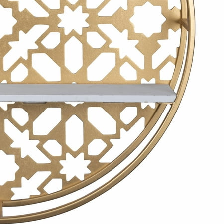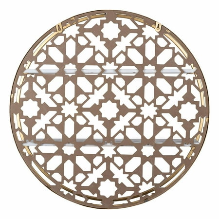 Flaunting a geometric Moroccan pattern design, the Stratton Home Decor Boho Round Laser-cut 2 Tier Wood and Metal Wall Shelf is more than ready to steal the show. It shows off a white distressed surface, made even more attractive by a matte metallic gold finish that adds a touch of luxury to your home.