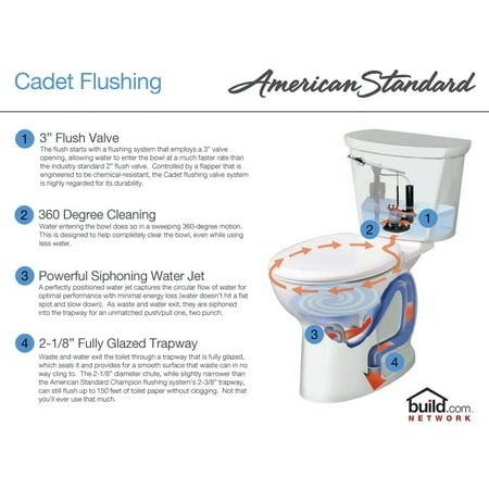 Coordinating Complete Toilets: 215DA.104 - Complete toilet with left-hand tank lever and 12" rough-in 215DB.104 - Complete toilet with left-hand tank lever and 10" rough-in American Standard 3517D.101 Features: Bowl only configuration - giving you the opportunity to select your matching tank Fully covered under a 5 year warranty - 5 times the industry standard Quick, quiet flushing - American Standard toilets are notoriously efficient and hushed Industry-leading flushing system out-performs older toilets while using less than 1/2 the water Constructed of vitreous china EverClean porcelain surface is extremely easy to keep clean, including inside the bowl PowerWash flushing completely clears the bowl, including under the bowl rim Sanitary bar on bowl prevents liquids from traveling under the tank Round bowl shape - space saving and more economical than elongated bowls Shorter-height bowl - appropriate for children and smaller adults Perfected porcelain casting process and adjustable tank anchors eliminate "tank wobbles" Straight-forward installation instructions for floor mounted installation are included with each toilet 100% factory flush tested - guaranteed to perform WaterSense certified - toilet uses 20% less water than the current standard while maintaining superior performance Cadet 3 Flushing: 3”Flush Valve – The flush starts with a flushing system that employs a 3” valve opening, allowing water to enter the bowl at a much faster rate than the industry standard 2” flush valve. Controlled by a flapper that is engineered to be chemical-resistant, the Cadet flushing valve system is highly regarded for its durability. 360 Degree Cleaning – Water entering the bowl does so in a sweeping 360-degree motion. This is designed to help completely clear the bowl, even while using less water. Powerful Siphoning Water Jet – A perfectly positioned water jet captures the circular flow of water for optimal performance with minimal energy loss (water doesn’t hit a flat spot and slow down). As waste and water exit, they are siphoned into the trapway for an unmatched push/pull one-two punch. 2-1/8” Fully Glazed Trapway – Waste and water exit the toilet through a trapway that is fully glazed, which seals it and provides for a smooth surface that waste can in no way cling to. The 2-1/8” diameter chute, while slightly narrower than the American Standard Champion flushing system’s 2-3/8” trapway, can still flush up to 150 feet of toilet paper without clogging. Not that you’ll ever use that much. Other Technologies / Benefits: Everclean Surface – Using the antimicrobial properties of silver (the precious metal), Everclean Surfaces inhibit the growth of bacteria, mold, and mildew. The super smooth, baked-in, mirror-like surface not only eliminates unsightly rings, but also helps repel toilet messes. PowerWash Rim – During each flush, a measured amount of water travels within an inner-rim channel to be evenly dispersed throughout the bowl. PowerWash rims are surprisingly good at completely clearing out the bowl after each use. American Standard 3517D