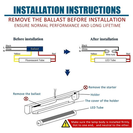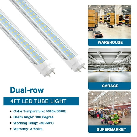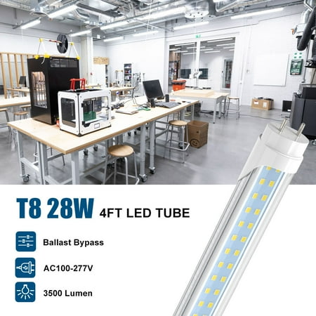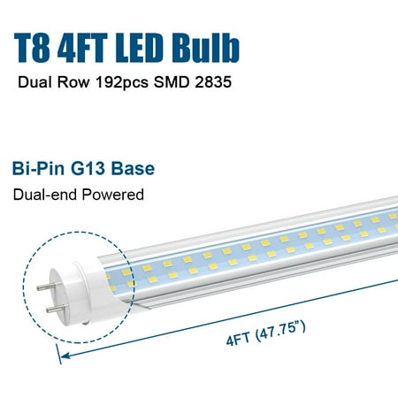 JESLED 28w T8 4ft LED tube light can illuminate your space with 3,500+ lumen with 180 degree angle beam. This 4ft led bulb is compatible with existing T8, T10, and T12 fluorescent fixtures. Like most of led bulbs, these double end powered T8 4 foot LED light bulbs require a simple, energy-saving, ballast bypass (direct wire) installation. And this 4ft t8 led tube is designed with dual row 192LEDs, which is much brighter than single led bulbs. With a heavy heat-sink and shatterproof cover, our 4ft led light bulbs have an outstanding life rating of 50,000+ hours! These super bright bi-pin g13 4ft led bulbs are ideal for replacing fluorescent bulb in your garage, warehouse, workshop and more. NOTE: Please install this item away from the radio, remote control door, etc., which may cause EMI. (Make sure REMOVED the original ballast and REWIRE before installation)