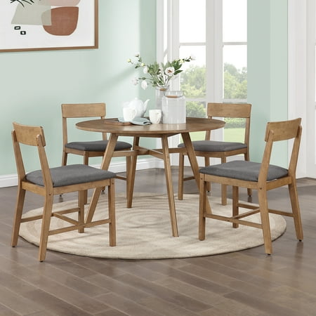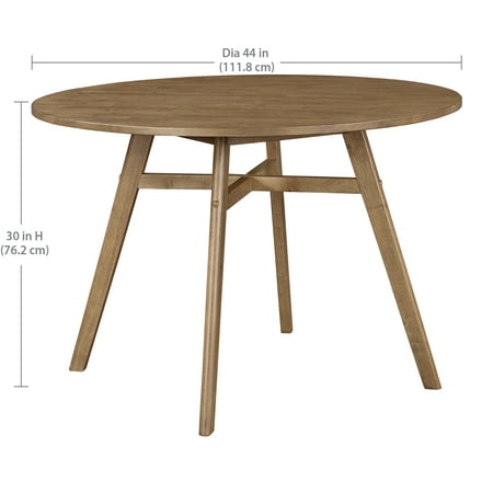 Beautifully elevate your kitchen or dining room space with the contemporary design and stylish finish of the Mainstays 44inch Round Solid Wood Dining Table and chairs set. The product featuring sturdy seating for 4. Comfortably seat your whole family on substantial chairs measuring L 18.2 x W 21.73 x SH 20.28 - H 33.15 INCH, the dining height to add unique design to your space. Feel confident in the chair fabrication of solid rubberwood frame, fabric upholstered seat and durable bentwood backrest. Easy to assemble in the comfort of your home, the Mainstays 44" Round Solid Rubberwood Dining Table is ideal for smaller spaces that can accommodate a low, small dining room set and is perfect for a cozy nook or corner of your kitchen. Suitable for any room where you and your family gather to enjoy mealtime, the Mainstays Solid Wood Dining Chair in Walnut Color finish is sure to complement a wide variety of decor sensibilities from eclectic to modern.