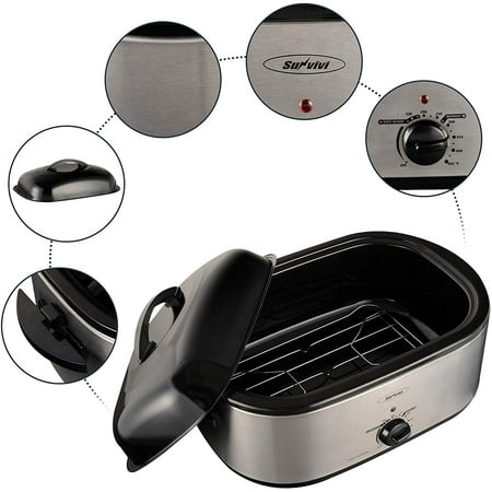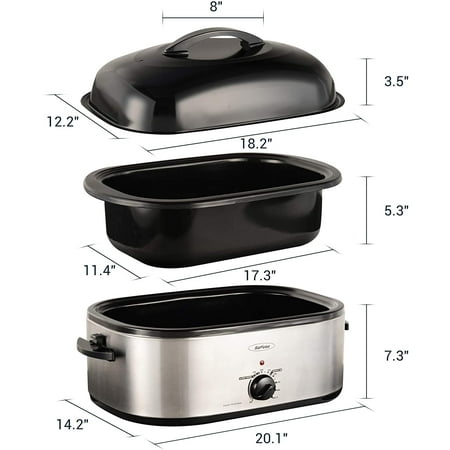Product Information: Large Capacity and Portable - High dome cover design, 20 Quart Electric Roaster Oven is perfect for baking, roasting, or boiling on holiday or at a party. Popular for indoor gatherings and courtyard BBQ! Multi-function - Versatile electric roaster bakes, slow cooks, roasts. Add more joy to your life. Powerful Functions - Self-Basting lid continually recirculates moisture, make the food more delicious; 1450W With Red Light; Full-range temperature control, make your food taste better at different temperatures. Heat Preservation -“KEEP WARM” function can keep the food at ideal serving temperature before the arrival of friends or guets. Your family, friends, and guests will enjoy the food. Anti-Scald & Easy to Clean - Cool-touch handle design for the lid and body, prevent your hand from being burnt; Removable insert pot and steel grill, make it easier to clean out. Specification: Color: White,Siver Dimensions: 20.1"""" L x 14.2""""W x 7.3"""" H Handle length: 8"""" Package Dimensions: 20 x 14 x 10 inches Item Weight: 17.5 pounds Why choose us? . Versatile electric roaster bakes, slow cooks, boiling, roasting or steaming. . Large capacity to accommodate the turkey, allow you and your family/friends enjoy the food on Thanksgiving Day. . Removable insert pot is the perfect companion for your cooking, baking and roasting whether indoors or outdoors. . Full-range temperature control and Self-Basting lid continually recirculating moisture, make the food more delicious. . Heat Preservation function keeps your food as fresh as bakering without worrying about dissipating heat with cooked food. . With cold-touch handle on the lid, it will pretect you and your family from burns. Customer service: - If you have any questions about our electric roaster bakes, please feel free to contact us at any time, we ptovide 7*24H customer-service