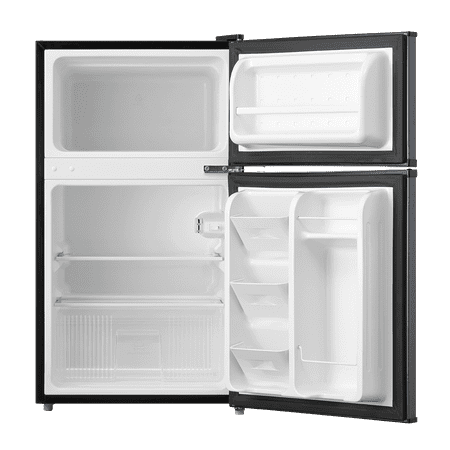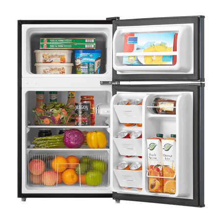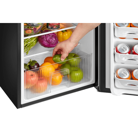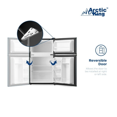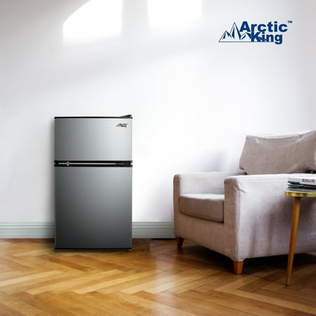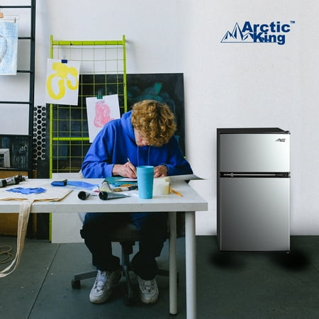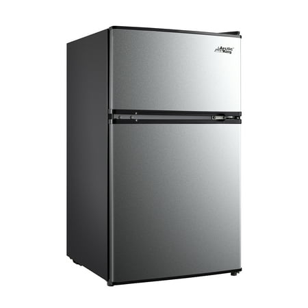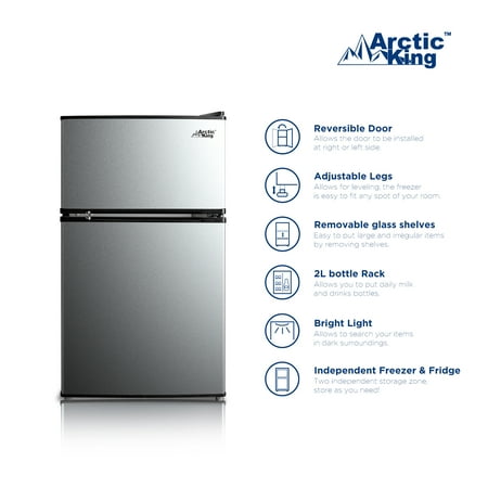 Arctic King 3.2 Cu. Feet Two-Door Mini Fridge with Freezer in Stainless Steel Introducing the Arctic King 3.2 Cu. Feet Two-Door Mini Fridge with Freezer in Stainless Steel - a versatile and compact solution for your refrigeration needs. With its sleek design and convenient features, this mini fridge is perfect for dorm rooms, offices, apartments, or any space where a compact cooling solution is required. Measuring at 18.5" by 19.4" by 33.3", this mini fridge provides ample space for storing your favorite beverages, snacks, and fresh produce. The separate freezer compartment allows you to store frozen goods, such as ice cream, frozen meals, and ice cubes, ensuring you have everything you need in one convenient unit. The stainless steel exterior adds a touch of modern elegance to any environment while providing durability and easy cleaning. The reversible door design enhances flexibility, allowing you to adjust the fridge's setup to suit your space and preferences. Inside, the fridge is thoughtfully organized with adjustable glass shelves, door bins, and a crisper drawer. These features offer customizable storage options, allowing you to efficiently organize and access your items. Operating with an energy-efficient E-star rating, this mini fridge helps conserve energy and reduce electricity costs, making it an environmentally friendly and budget-conscious choice. The Arctic King 3.2 Cu. Feet Two-Door Mini Fridge with Freezer in Stainless Steel, with its compact size and versatile features, is a reliable and space-saving addition to your living or working space. Experience the convenience of chilled beverages and frozen snacks at your fingertips - order now and upgrade your cooling experience today.