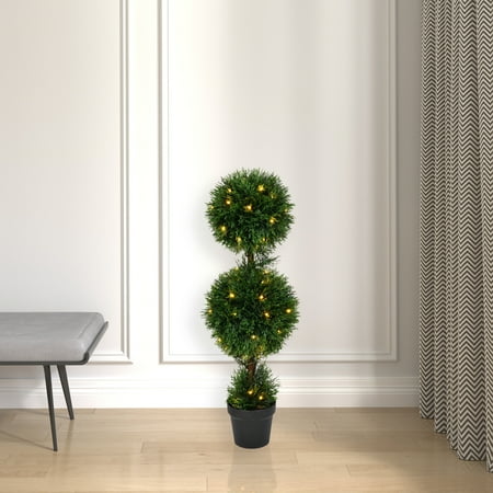 Vickerman 3' Artificial Double Ball Green Cedar Topiary, UV Resistant, Comes In A Black Plastic Insertable Pot, Making This Plant Easy To Place In The Decorative Container Of Your Choice. Pot measures 5" high x 7.5" in Diameter. This artificial topiary is wrapped with 70 warm white 3mm LED lights.