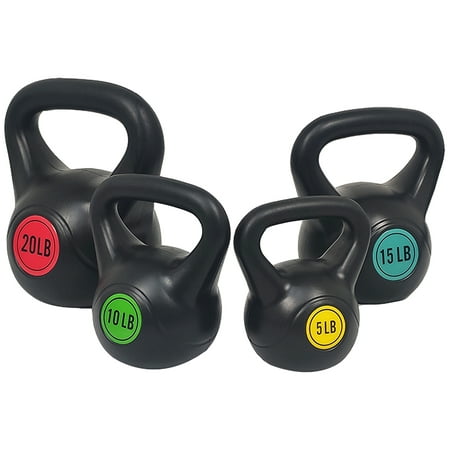 Training with kettlebells allows you to select resistance training exercises based on their similarity to actual movements that occurs during sports. kettlebells require more balance than training with barbells or machines, and balance is crucial for optimal performance. kettlebells also require more muscular control than barbells, thus enhancing kinesthetic awareness. The best part of training with kettlebells is it allows the athlete to train through a greater range of motion than barbells on some exercises. Understand that it is sometimes more valuable to trade heavy weights (Barbells) for more sport-specific movements. Kettlebell exercises demand the use of multiple joints, which engage all the larger muscles of the body. Compound kettlebell moves burn calories faster than isolation moves, which only work one muscle. 50 lbs. Kettlebell Set Include: 1 x 5lbs, 1 x 10 lbs., 1 x 15 lbs., 1 x 20 lbs. Vinyl coated. Set of 4.