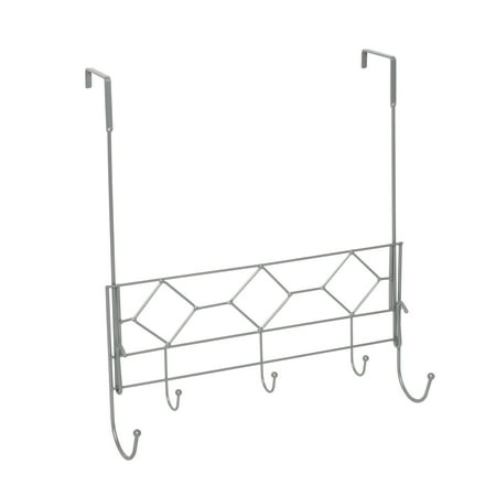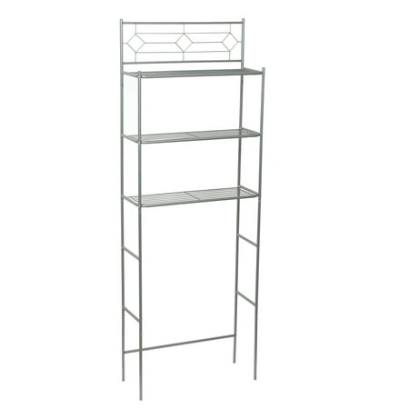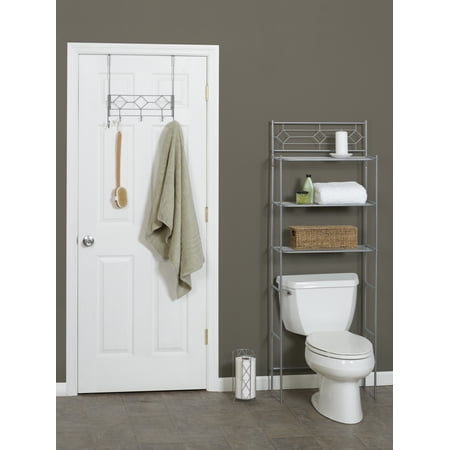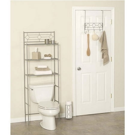 The Zenna Home Bath in a Box set includes a bathroom space saver, an over-the-door rack with hooks, and a toilet paper holder. The set provides an all-in-one solution for bathroom storage. All three pieces have a coordinated diamond design. Made of strong and durable steel, each piece is rust- and chip resistant. The space saver will fit over any standard toilet (up to 34.75 inches high) to create valuable storage on its three large wire shelves. The over-the-door rack includes five hooks for hanging storage of towels or clothing. The matching toilet paper holder provides storage near the toilet. All three pieces have a rich satin nickel finish.