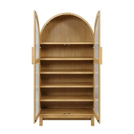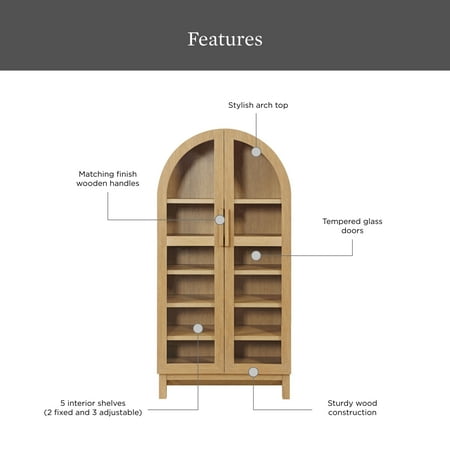 The Better Homes & Gardens Juliet Arch Cabinet is the epitome of elegance and functionality in home organization. This exquisite piece of furniture seamlessly combines style and practicality to elevate any living space. Crafted with meticulous attention to detail, the arched cabinet boasts a sturdy wood construction that ensures durability and longevity. The arch design adds a touch of timeless charm, making it a focal point in any room. The cabinet's five interior shelves provide ample space for storing and displaying your cherished items. Whether it's showcasing your collection of fine china, family heirlooms, or treasured books, this cabinet offers a perfect balance of open and concealed storage.The tempered glass cabinet doors not only contribute to the aesthetic appeal but also provide a clear view of the contents within. One of the standout features of this arched cabinet is its soft-closing, euro-style hinges. Whether it’s in your living room, dining room or home office, elevate your home decor with this exquisite piece that not only organizes your belongings but also adds a touch of sophistication to your living space.