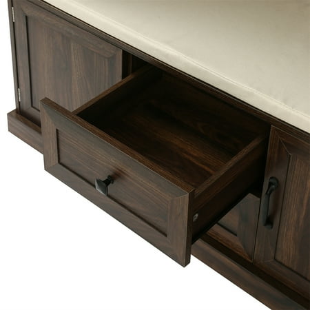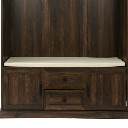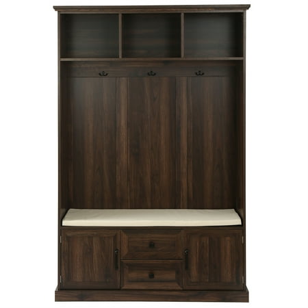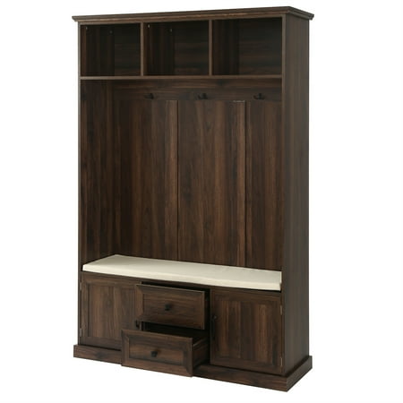Description: Classic details give our Storage Locker a traditional look, but clean lines and a modern finish bring this hall tree into the now. 3 open cubbies lie below it, awaiting your display items, books, accessories and more. The open area beneath the cubbies features elegant beaded-board paneling, 3-double hooks for coats and bags, and a comfortable seat with cushion. The grand finale of this storage piece, 2-drawers and 2-doors that allow you to store away even more necessitie. Weights & Dimensions Hall Tree: 70.9'' H x 15.74'' W x 47.24'' D Top Weight Capacity: 22lbs Top Cabinets Capacity: 11 lbs Cabinets Capacity: 44 lbs Table Top Thickness: 1.37 Inch Clearance-Floor to Bottom: 2.75 Inch Overall Product Weight: 100 lbs Hook Weight Capacity: 6 lbs Cabinets Size: 14.3'' H x 13.37'' W x 14.3'' D Cushion Size: 1.18'' H x 13.38'' W x 43.7'' D Specifications Pieces Included: 1 Hall Tree Top Shape: Rectangle Top Material: Particle board Base Material: Particle board Number of Shelves: 3 Number of Drawers: 2 Number of Cabinets: 2 Level of Assembly: Full Assembly Needed Suggested Number of People for Assembly/Install: 2 Adult Assembly Required: Yes Additional Tools Required(Not Included): Power Drill recommended Kind Reminder: Product pictures are for reference only. Real product's color may be a little different from the image due to the lighting or monitor's display. If you have any problems, please feel free to contact us, we will try our best to make you satisfied.