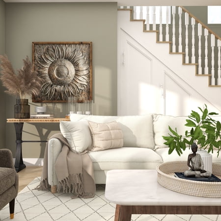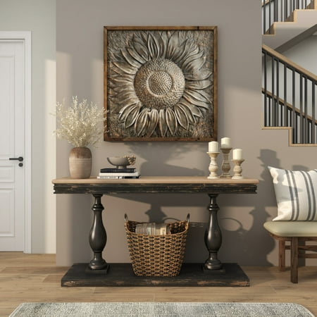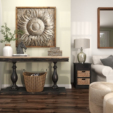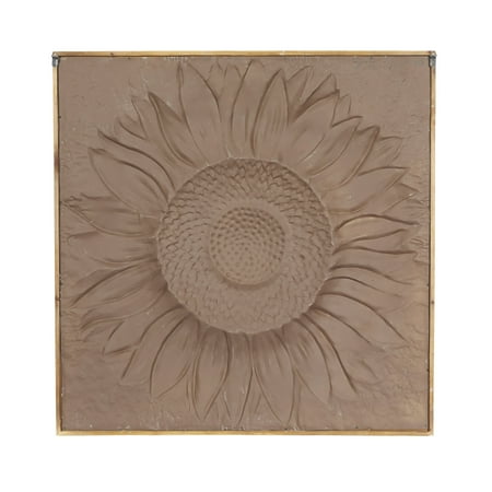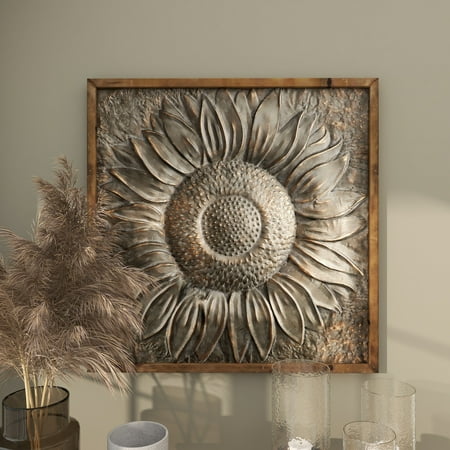 DecMode Gray Metal Sunflower Floral Wall Decor with Embossed Details is a unique addition to your stylish home. This metal sunflower wall decor is the perfect finishing touch for a muted section of the living or dining room needing a large decorative wall space filler. This item ships in 1 carton. Large square wood frame housing a metal sunflower image. Can be hung vertically using the D-rings on the back; nails and screws not included. Suitable for indoor use only. This item ships fully assembled in one piece. This is a single gray colored wall sculptures. Rustic style.