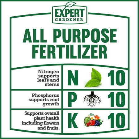 Expert Gardener All Purpose Plant Fertilizer 10-10-10 40 lb., is for use on trees, shrubs, flowers, and vegetable gardens. Fertilizer formulation created for quick release for beautiful foliage, more vegetables and root growth. When using on flowers and vegetables spread evenly on the bed surface and work into the top 2 to 4 inches of soil surface before planting. For vigorous growth, repeat application every 6 weeks during the growing season working into the soil surface along rows or around plants.