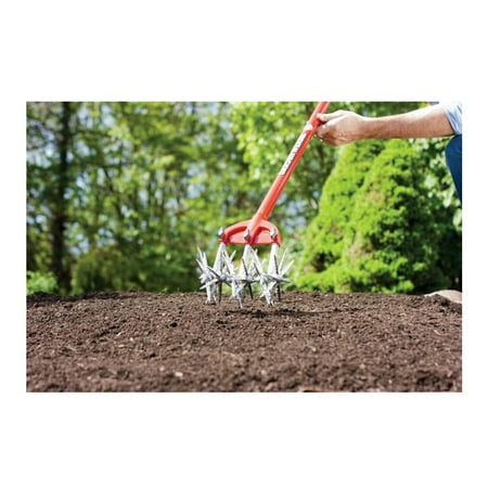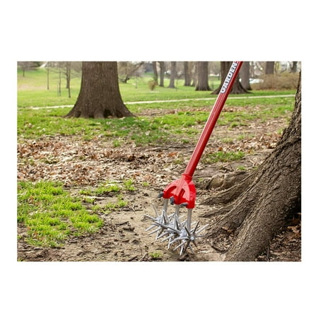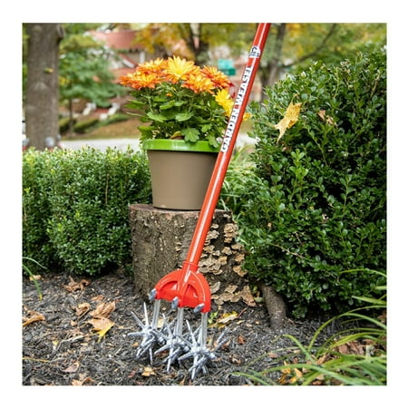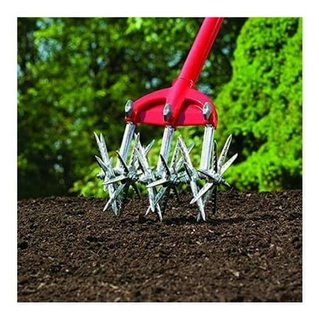 Garden Weasel Cultivator – Break Up Soil, Detachable Tines, Long Handle, 54.5” Long. A Weed-Free, Backache-Free Garden Hard, rocky soil and tough weeds have met their match. Its four serrated, scissor-like tines intertwine as they turn to easily loosen soil and uproot weeds. No bending, stooping or hoeing - just push it back and forth. Aerates soil at a constant 1-1/2" depth. Detach 1 or 2 tines to work between or over narrow rows. Durable carbon steel construction Comfort-grip handle with hanging loop. Rust-proof tines . 55"L overall. Tines 5-1/2"OD. 2-1/2 lb.
