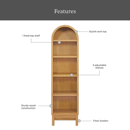 Introducing the Juliet Narrow Arch Bookcase, a perfect blend of form, function, and flair for your home. This bookcase is a statement of elegance and versatility, designed to enhance any interior décor. With its rounded arch top, the Juliet Narrow Arch Bookcase captivates with architectural grace and a modern twist, available in two chic finishes: Light Honey and Black. These options ensure a perfect match for your personal style, whether you're aiming for a bright and airy vibe or a sleek, sophisticated look. The Juliet stands out with its five spacious shelves, each adjustable to accommodate your collection of books, cherished collectibles or decorative pieces. This flexibility makes it an ideal solution for those who love to refresh their spaces or display an ever-changing array of items. The shelves are built to be sturdy, ensuring that your treasures are displayed securely and stylishly. Crafted with durability in mind, the Juliet Narrow Arch Bookcase promises long-lasting quality. Whether it finds a place in your living room, study, or hallway, this bookcase is designed to elevate your space and showcase your style with sophistication. Make the Juliet part of your home and enjoy the perfect combination of beauty and practicality it brings to every corner. It's more than a bookcase – it's a centerpiece that reflects your taste and complements your lifestyle.