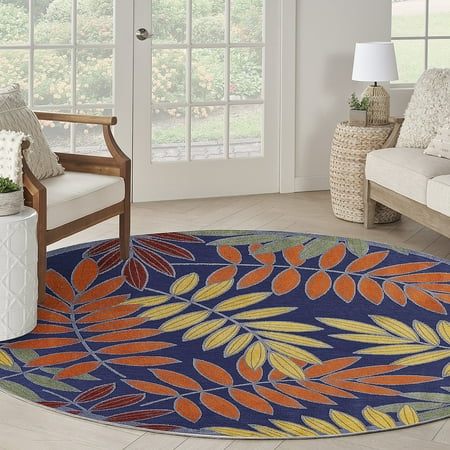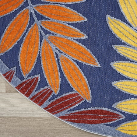 This sunny and sensational collection of flat-woven indoor/outdoor rugs is pretty, practical, and perfect for high-traffic areas. With its inviting assortment of classic and contemporary designs, tempting color palettes, and terrific textures, these multipurpose rugs will afford an air of simple sophistication to any environment. The cheerful and charming oversized leaf design of this Aloha outdoor rug is a fun way to bring tropical style to your patio, balcony, porch, deck, or yard. The high-low weave, presented in shades of orange, green, yellow, and red, adds soft texture and a pop of dimension designed to spark conversation. Created from premium stain-resistant fibers for long wear and low maintenance: simply hose rinse and air dry. To extend the life of your rug, bring indoors during extreme weather.