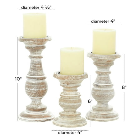 DecMode 3 Candle Cream Mango Wood Turned Style Pillar Candle Holder, Set of 3 is a unique addition to your stylish home. Give your space a radiant illumination with these beautifully crafted candle holders. Made with a sturdy base, it is perfect for creating an elegant atmosphere at your table top or mantel. Place this cream set of 3 candle stands in your living room or dining area to elevate any occasion with its warm glow. Designed with felt or rubber stoppers at the base that prevent scratching furniture and table tops, as well as sliding around. Can hold 3 pillar candles, not included. This item ships in 1 carton. Mango wood candle holder makes a great gift for any occasion. Suitable for indoor use only. This item ships fully assembled in one piece. Made in India. This cream colored mango wood candle stand comes as a set of 3. Traditional style.