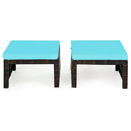 Our ottoman is a perfect match for outdoor rattan furniture. Whether as a footstool to provide support for the feet or as a simple chair to rest, this multi-purpose ottoman is the best choice. The x -shaped structure at the bottom of this footstool combined with the reinforced crossbar makes it durable and can withstand a max imum of 355 lbs. The seat cushion with hidden zipper can increase comfort and facilitate your daily cleaning. It is worth mentioning that the cushion and the footstool can be tightly connected through the buttons to prevent the cushion from falling. Weather-resistant PE rattan is intended to withstand different weather outdoors without fading. Feature Sturdy x -frame and reinforced crossbars ensure robustness Made of weather-resistant PE rattan, suitable for outdoor use With Soft cushion, for good water resistance and max imum comfort The cushion with hidden zipper for easy removal and washing Solid connection to prevent the cushion from slipping off Protective foot pads can be able to enhance stability Elegant look, suitable for any space such as courtyard, garden, poolside, and more Multifunctional design, can be used as a seat or footrest Specification Color of Cushion:Turquoise Color of Rattan: Mix Brown Material: PE Rattan + Sponge Product Dimension (Cushion Included): 19.5'' x 15.5'' x 13'' (L x W x H) Net Weight: 14.5 lbs Max imum Weight: 355 lbs Package Includes: 2 x Ottomans 2 x Cushions 1 x Instruction