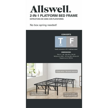 Get versatility and convenience with the Allswell 2 in 1 Convertible Platform Metal Bed Frame. This no tools needed, easy-to-assemble metal frame is all about practicality: it's easy to put together, and with a folding design, the bed frame can be folded for space-saving storage or transport. Once assembled, this lightweight bed frame provides ample under-bed storage space and comes with built-in caps to protect your floors. Plus, you can place your mattress directly onto the frame without the use of a box spring. This 2 in 1 bed frame converts from twin to full and queen to king quickly and easily, so you can accommodate a changing number of guests without hassle. Maximize your space with the help of the Allswell Convertible Platform Metal Bed Frame. Recommend age group: Teen or Adult. Assembled Product Weight 31.72 lb.