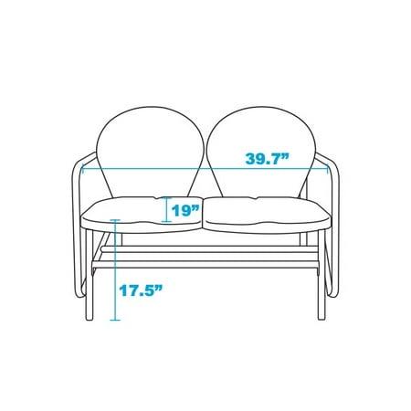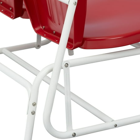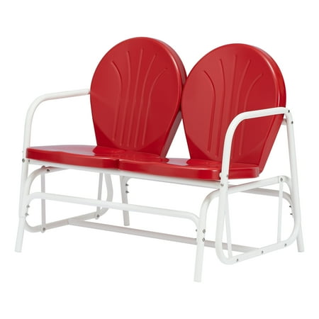 Sit back and relax in this two-person retro glider loveseat. Weatherproof construction with durable powder-coated steel frame finish for UV and corrosion resistance. Comfortable channel back design. This loveseat rocks back and forth effortlessly and is perfect for placing on porches, decks, patios, yards, and anyplace else you want to enjoy the outdoors in comfort. Easy to assemble. Available in Red and White, Yellow, and Teal to complement virtually any outdoor style.