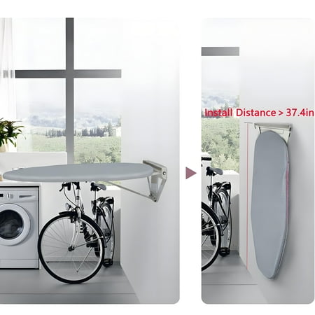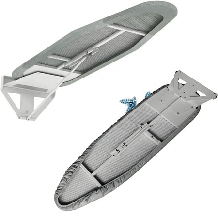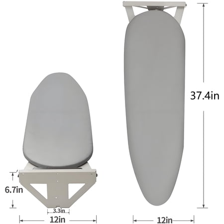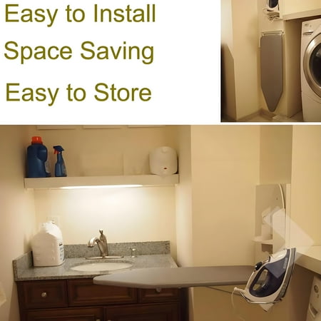 tonchean over the doors ironing board is very safe and secure and locks firmly into position. visible metal parts are plastic coated in a bright clean white, the folding ironing board comes with one heat-resistant ironing board cover that can be easily removed, and can keep ironing board out of sight and clean when not in use.the wall mounted ironing board comes with a metal plate, which can be easily screwed on the wall. expanded board size: 37.4"l x 12" (w)x 1.4"(h), load capacity: 27lbs. ironing board has a foldable design with a easy lock mechanism, pull out the buttom clik to open the board when used, folded up at leisure, easy to use, save space. Wall Mounted Ironing Board Features: 1. this wall mount ironing boards with Metal structure, zinc alloy connections, the wall mounted ironing board is strong and durable. 2. our wall mount iron board is with safety insurance. The ironing board has has strong bearing capacity, safe and stable when use it. 3. this ironing board space saving. Fold down design, convenient to storage and save space. 4. the wall mount folding iron board, Easy to install and operate. Connect the metal shelf to the wall by screws easily. 5. Notice: The install height should be >37.4 inch from the floor. So the heavy duty ironing board can be fold down for storage. 6. Our wall mount ironing board Size: (L) 37.4 x (W) 12 x (H) 1.4 inch Specifications: Condition: Brand New Type: Fold Down Ironing Board Material: Stainless steel+Board+Cloth Color: Gray Size: (L) 37.4 x (W) 12 x (H) 1.4 inch Load Capacity: 27lbs Package Includes: 1 x Wall Mounted Ironing Board with Heat-resistant Cover