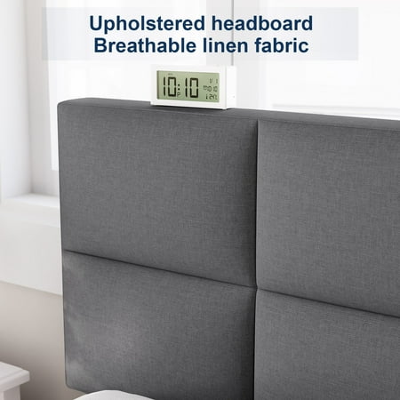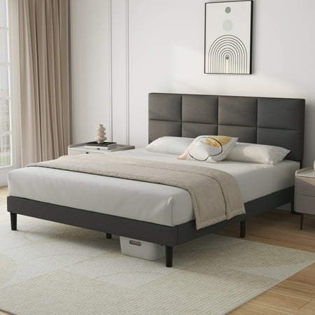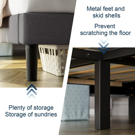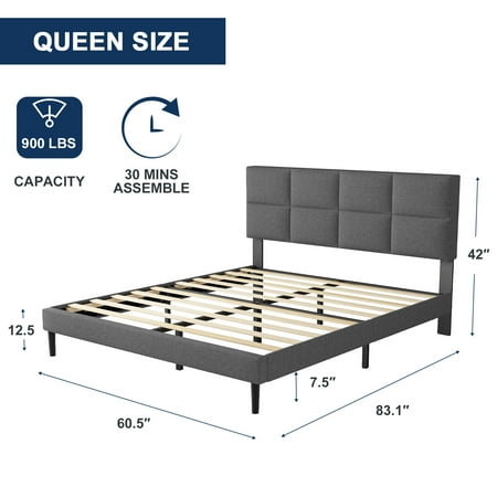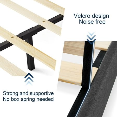 HAIIDE Queen Size Upholstered Platform Bed Frame with Headboard provides a modern style and create a unique sense of exquisiteness for your bedroom.Its framework is constructed with durable steel and center support legs that eliminate sagging and even extend the life of your mattress. The padded headboard, offers extra comfort and adds a hint of glamour. The included slats unroll to provide reliable support to your mattress while eliminating the need for a box spring and providing under-bed storage space.all parts, tools and instructions are conveniently located in the zippered compartment of the headboard for easy.Smartly packaged in one carton for moving around quickly and shipped straight to your door. You can install the bed frame by yourself or with your family in a short time.Available in various sizes:Twin,Full and Queen.