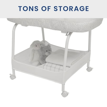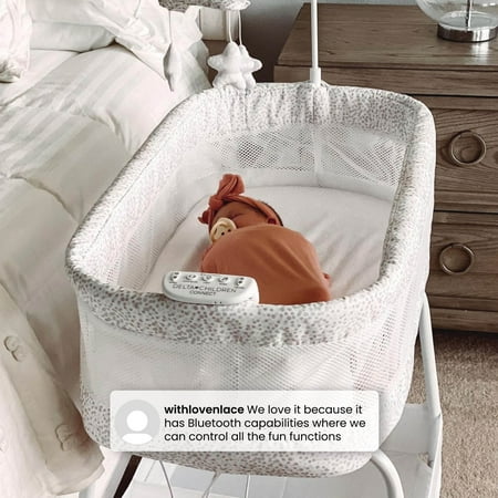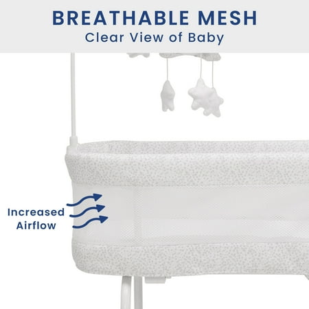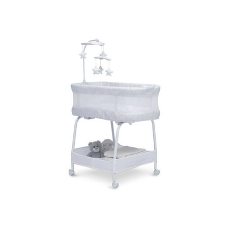 The Delta Children SmartSleep Auto Glide Bassinet with Bluetooth is a modern close-to-the bed sleeper that boasts state of the art technology. The Bluetooth enabled design easily pairs with the Delta Children Connect App, where you'll be able to wirelessly control and customize the length and speed of the auto glide motion, sound level of the music and nature noises, as well as the brightness of the nightlight. Designed to help your baby fall asleep faster and stay asleep longer, the hands-free auto-glide motion will provide a calming environment while the two-tier toy arm with plush stars will engage and delight your baby if they wake up in the middle of the night. Breathable mesh sides all around provide increased airflow and a clear view of your sleeping baby. Other stand-out features include: large storage basket, comfortable 1-inch waterproof mattress pad with machine washable fitted sheet and wheels that make it easy to move around the house. Get the Delta Children SmartSleep Auto Glide Bassinet and help soothe baby back to sleep (without getting out of bed!). The Delta Children Connect App is free to download and available on the Apple App Store or on Google Play. This bassinet is recommended for babies 0-5 months. Max weight 30 lbs. Stop use at 5 months or once your infant begins to push up on their hands and knees, whichever comes first. Delta Children was founded around the idea of making safe, high-quality children's furniture affordable for all families. They know there's nothing more important than safety when it comes to your child's space. That's why all Delta Children products are built with long-lasting materials to ensure they stand up to years of use. Plus, they are rigorously tested to meet or exceed all industry safety standards.