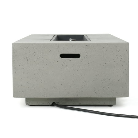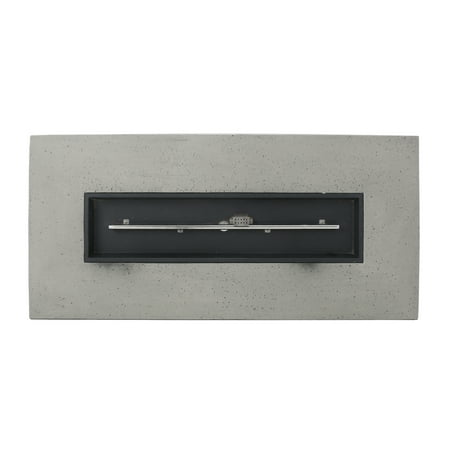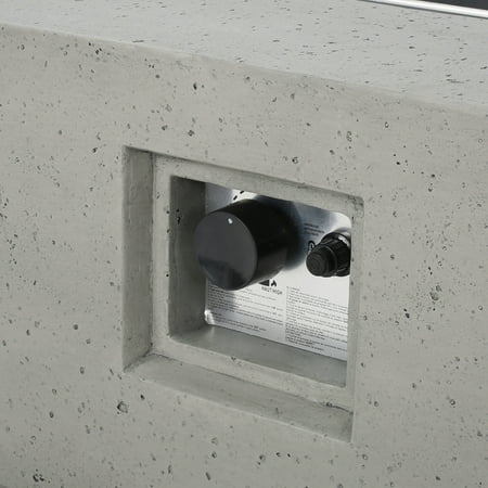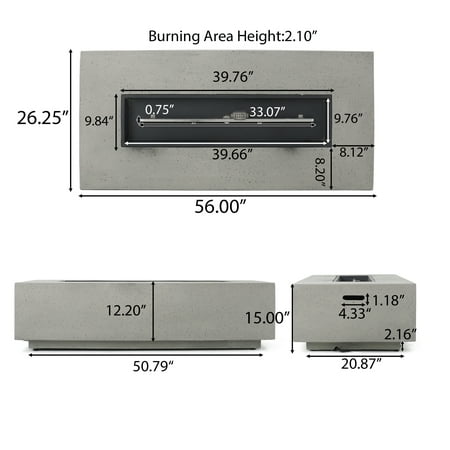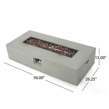 Gather your friends and family around an open fire with our stunning fire table that will bring the conversation to life on those clear, cool nights. Highlight your patio or backyard space with this luxurious accessory while keeping your company snug with its all-inclusive seating possibilities. Its simply shaped structure and sleek, modern look bring you and your guests together for intimate conversations and endless fond memories. Complete with brilliant lava rocks, this centerpiece is an excellent addition to any outdoor set. MODERN DESIGN: Featuring a sleek, rectangular shape, this fire table allows you to easily seat your guests around a warm fire. Its straight lines and precise angles create a minimalistic look for any patio space. LIGHTWEIGHT CONCRETE: This fire table is constructed with lightweight concrete for a smooth, clean look. The shape allows easy seating arrangement for you and your guests, providing light and warmth all around during those chilly evenings. TANK HOLDER: This fire table comes with a matching tank holder to keep your propane tank inconspicuous. This is also made of lightweight concrete so you can arrange this piece however you please and your set will always look classy. DIMENSIONS: Choose an accessory that is the perfect size for you and your furniture. This fire table is 56.00” W x 26.25” D x 15.00” H with a tank holder that is 16.25” W x 16.25” D x 20.25” H. You will love how much your space can transform with the simple addition of this charming fire table. NO ASSEMBLY REQUIRED: No assembly is required for this fire table. Simply place the lava rocks in the pit without covering the burner, and then plug in your standard size propane tank and enjoy your fire pit.