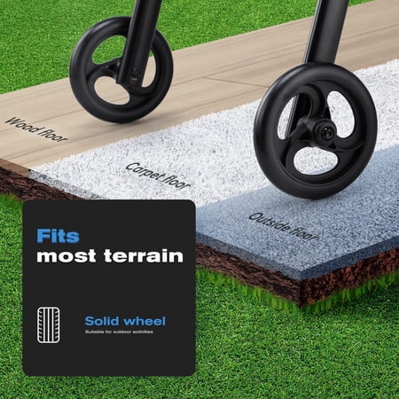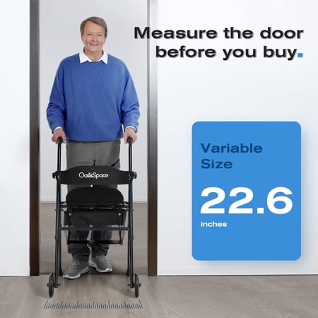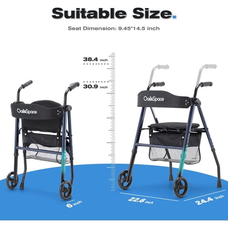 OasisSpace 2 Wheels Walker for Senior The support offered by OasisSpace Two Wheeled Walker with Seat makes it a safe mobility on the off chance that you experience some surgery, experience issues keeping your equilibrium or are in danger of falling while walking. Designed with handles like a Rollator walker, and combinated of wheeled front legs and padded back legs , this folding walker eliminate the shortcoming of picking up it which making for a smooth, easy movement. Furthermore, the walker adds an comfortable seat and backrest that make you relax wherever you go. Halting is speedy and simple by pushing down on the back legs to slow down. Reliable Back Support Any time you want to take a break, there are always a soft backrest and a comfortable seat that give you a reassuring experience~ Convenient Storage Space When you go for a walk or go to shopping, the storage pouch of this walker often gives you a palce to Place your personal belongings! 6’’ Smooth Wheels Two wheels of OasisSpace adult walker can easily move on most terrain smoothly, reducing walking address from users.