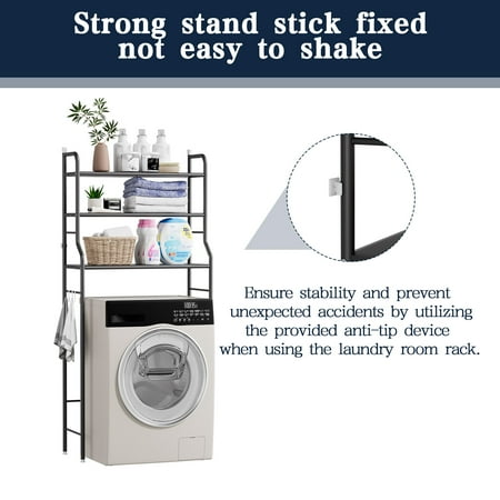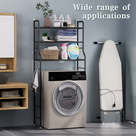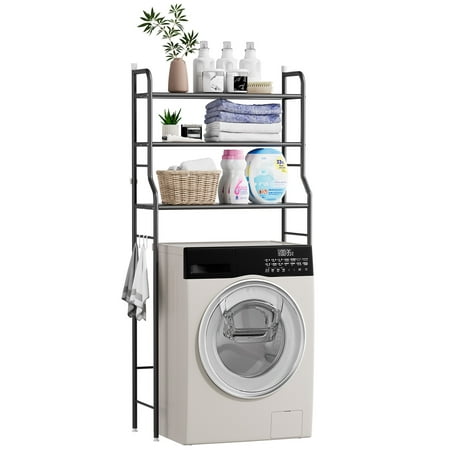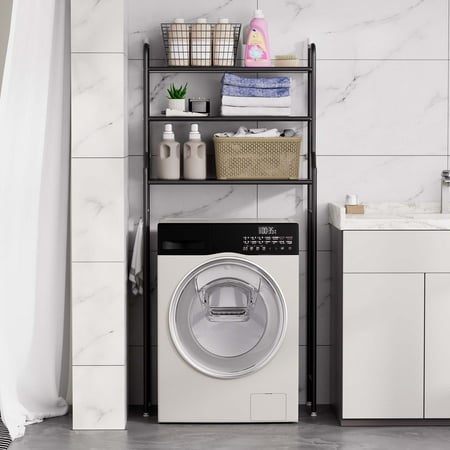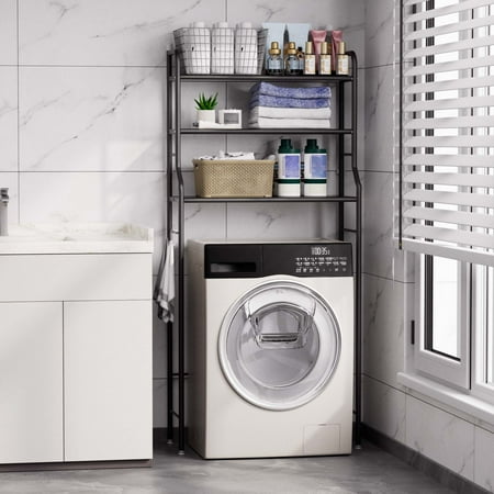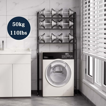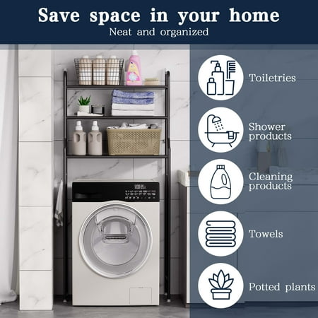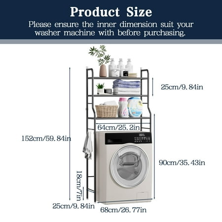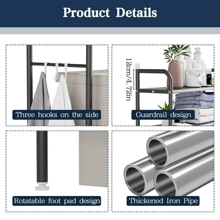 Description Our washing machine rack is designed to increase the storage space in the laundry room, and the size of the rack 26.77"L x 9.84" W x 63" H does not take up too much space, making it easier for you to store and retrieve items. The three-layer design can make the storage and sorting of items more reasonable and efficient. The thickened steel frame design provides higher stability and load-bearing capacity. Adjustable screw foot pads can easily adapt to a variety of floor environments, firm, non-slip and protect the floor. Don't hesitate to choose our three-tier washing machine. Warming Tips: When you measure the reserved space, please pay attention to the distance between the 2 sides of the baseboards. Measuring the width of your washing machine or the dryer before you purchase it. Specification Condition: Brand New Color: Black Material: Iron Shape: Rectangle Overall Dimensions (L x W x H) : 26.77" x 9.84" x 63" Product Weight: 5.5 lbs Maximum Load Bearing: 110 lbs Feature: Corrosion and Rust Prevention Package Includes: 1 x 3-Tier Washer Storage Shelf