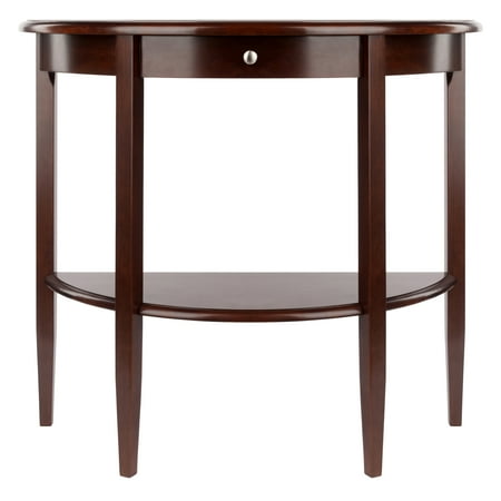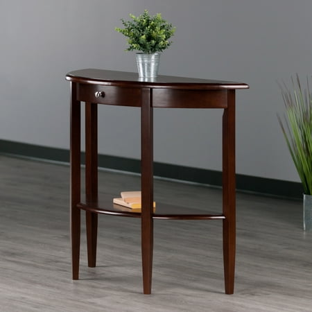 The Winsome Wood Concord Console Table is a wooden classic piece of furniture that is built to last. Constructed of a sturdy solid wood and veneer, the half-moon design is a perfect entryway piece with timeless beauty. Ideal for the foyer as a display table for a flower vase or simply to place a nice lamp in your living area all while still conserving space. Featuring a concealed drawer that provides space to keep small accessories, keys, or pens. In addition, the shelf below serves as ample space for your books, collectibles or photos. Finished in a warm walnut, you can coordinate this console table with other pieces from the Winsome Concord collection for a unified space (each sold separately). Conveniently packed and shipped in 1 box, that includes the hardware necessary for assembling. Replacement part request can be submitted directly to the manufacturer within 60 days from date of purchase.