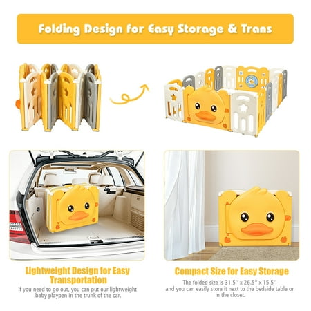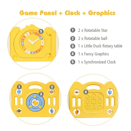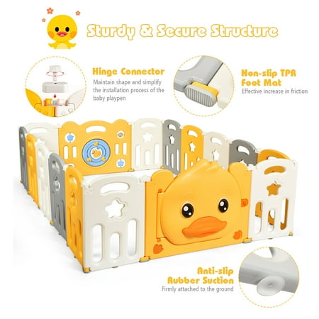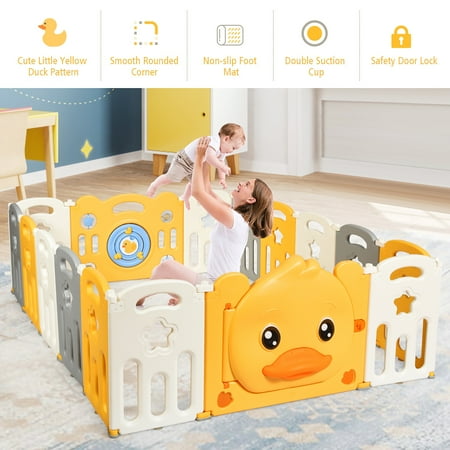 Are you still too busy taking care of your baby to have time for housework and rest? Our baby playpen can free your hands and give your children space to explore independently. The unisex baby playpen is made of non-toxic, BPA free HDPE material to ensure baby’s safety. The design of hinged door with safety lock and non-slip silicone base increase the overall stability. By adjusting the tightness of the hinges, you can adjust the fence to a suitable shape to adapt to different sized rooms and provide children with ample play space. The game panel can not only stimulate children's imagination, but also exercise their cognitive ability and motor skills. In addition, the quick installation and foldable design makes it easy to place in any corner of the house or in the car. Come and buy, our baby game fence will be your perfect choice. Feature 26.5'' heightened panel can better prevent the baby from getting out of the fence Costway Non-toxic and durable HDPE material ensures your baby's safety, and easy to clean Non-slip rubber mats make the fence less prone to displacement Anti-slip suction cups at the bottom to firmly fix all the panels Hinge design helps to maintain shape and simplify the installation process Security lock can prevent the child from running out of the fence Cute little yellow duck pattern and various toys on the toy panel attract the attention of the child Cute voiced duck bill on the door for added fun Foldable design for easy movement and storage Combine the panels into the desired shape according to your needs Provide enough spacious space for your baby to crawl, stand, walk and play Easy to assemble, disassemble and move Specification Color: Yellow + White Material: HDPE Product Dimension: 63’’ x 81.5’’ x 26.5’’ (L x W x H) Door Panel Size: 31.5’’ x 26.5’’ Game Panel Size: 31.5’’ x 26.5’’ Small Panel Size: 15.5’’ x 24.5’’ Door Panel Thickness: 2.5’’ Small Panel Thickness: 1’’ Product Weight: 33.5 LBS Package includes: 1 x Door Panel 1 x Game Panel 14 x Small Panel 16 x Foot Mat 16 x Sucker 1 x Instruction