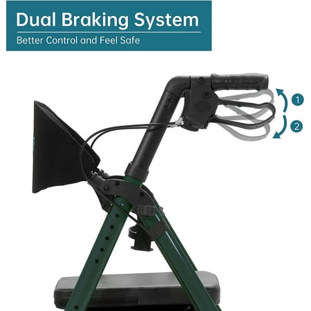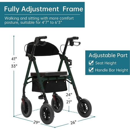 Elenker All-terrain Rollator Walker with 10” Non-Pneumatic Wheels 10” Solid polyurethane flat-free tire, explosion-proof tires, non-slip, wear-resistant, with good shock absorption, easy to maneuver on grass, gravel, dirt and gaps in sidewalks. Large Capacity: For your personal belongings, convenient to go shopping and carry daily items. Keep Cup with You at All Times: Secures the cup in place to prevent the beverage from moving and spilling. Leave Your Hands Free: Focus on walking, convenient to go outside. Prevent from Tipping Over: Use it to overcome obstacles such as curbs and thresholds. Space Saving: Just pull up under-seat bracket to fold, easy to store or transport. Specifications: Recommended Height: 4’7” to 6’3” Overall Dimensions: 29” (L)x26”(W)x33”-41”(H) Seat Dimensions: 14”(L)x14”(D)x21”-24”(H, from ground) Wheels Size: 10” Front and 10” Rear Wheels Material: Solid Polyurethane Flat-Free Tire Unit Weight: 18 lbs Weight Capacity: 300 lbs Frame color: Blackish Green
