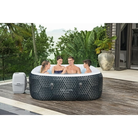 After a long day, there’s nothing more relaxing than sinking into warm, bubbling water right in your own backyard. The SaluSpa® Monterey AirJet™ 6 provides a soothing massage experience for up to 6 people, while still being quick and easy to set up. This spa reaches up to 104ºF (40ºC) to provide ultimate relaxation as you are surrounded by 140 AirJet massage bubbles. Simply attach the pump and watch as it inflates. Soothing Massage System: The AirJet system features 140 jets which release bubbles from the bottom of the spa to create a warm, bubbling hot tub environment. These soothing bubbles will help you relax and unwind right from the comfort of your home. Durable Construction: The external wall is constructed with 3-layer Tritech® material, proven to be both puncture and damage resistant. This material offers exceptional stretch resistance, allowing the spa to maintain its intended shape over time, no matter how many times you inflate and deflate it. Innovative Winterizing Technology: The included Freeze Shield® automatic heating function prevents inner components from freezing during colder temperatures. Designed with innovative winterizing technology, the system will keep the internal temperatures between 42º and 50ºF (6º and 10ºC) to prevent damage. Electrical Safety Information: Our spas feature a Ground Detection System that ensures the spa is used with an outlet having a proper ground connection, providing additional electric current protection. Only use a grounded socket corresponding to the electrical rating of the attachment plug. NEVER use an extension cord or multi-plug adaptor. Be sure to regularly inspect both the plug and socket for signs of damage, and do not plug the product back into the socket if damage is found. Read the manual thoroughly before setting up your hot tub. Contents: Equipped with a pump that quickly inflates the hot tub, heats it up, runs filtration and controls the massage system, this spa is both easy and convenient. The pump can easily be reached from inside the hot tub and features cup holders for drinks and snacks. Also included is a ChemConnect® dispenser that maintains clean, healthy water by evenly dispersing the proper amount of chlorine. This hot tub comes with a reinforced cover designed to lock in heat when not in use and keep dust and debris from collecting on the water. The Original Premium Portable Spa™: SaluSpa is the original manufacturer of the world's first premium portable spa. Over a decade of advanced engineering innovations have built a name that consumers have grown to trust.