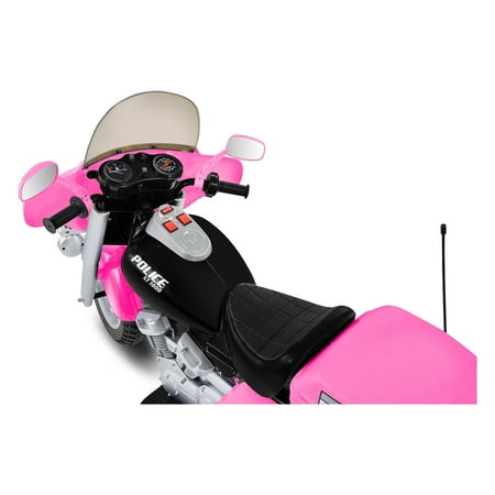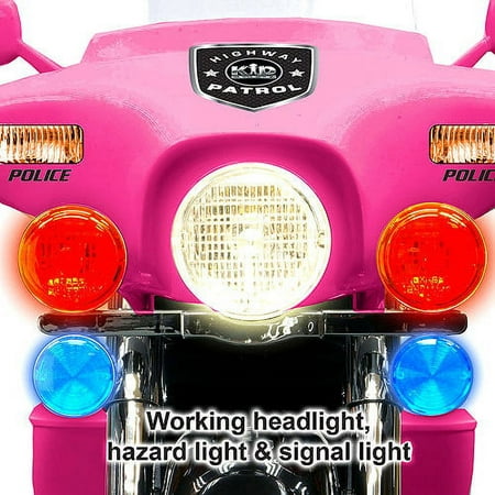 Little ones will rule the sidewalk with this kid-sized Police Patrol, in a pink version! This cool bike can whiz along at up to 5.0 mph. Let your kids enjoy the ride as they patrol the sidewalk and keep your home safe. With its cool electronic sounds and hazard lights, your child can play pretend as they cruise along! 2 forward motions (2.5 & 5.0 MPH) and 1 reverse (2.5 MPH). Hand accelerator. Headlight, Hazard light & Signal light. Electronic sound. Storage box. Chromed details. Requires one 12V Type "H" battery and charger, included. Adult supervision recommended. Product measurement: 48.4"L x 24.2?W x 32.2?H. Carton measurement 38? x 20? x 22?. 1unit per carton. Holds up to 88 pounds. . Ages 3 ? 6 years. Made in China