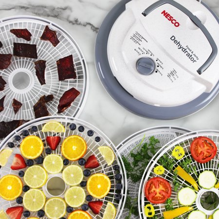 The Nesco Professional FD-75PR Dehydrator comes with 600 watts of power for faster food drying time. It features a contemporary granite Vita-Save exterior that helps retain more vitamins and nutrients during the drying process. The dehydrator sports an adjustable thermostat that allows you to choose the temperature for drying from 95 to 160 degrees, ensuring exact results that you desire. The 600W food dehydrator comes with an expandable design that allows you to dry food up to 12 trays. With a practical, even drying system, you are not even required to rotate the trays every few hours for better performance. Get the thermostat food dehydrator for your kitchen and enjoy fast food drying in a matter of hours.
