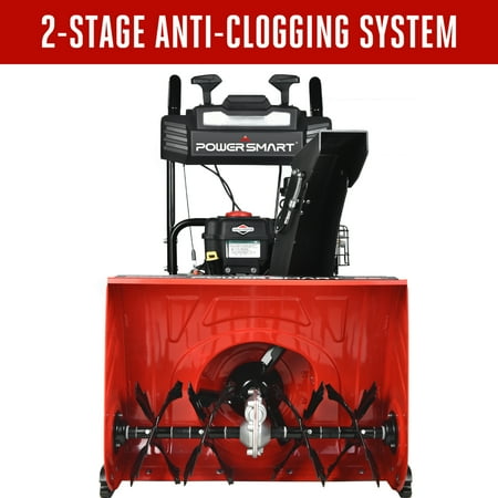 Clear snow like an absolute pro with the Powersmart 24 inch Two Stage Electric Start Gas Snow Blower with 208cc Briggs and Stratton Engine. The versatile control panel, remote chute control and 180 chute rotation makes your job simple. The 208cc Briggs and Stratton Electric Start engine will give you up to 40 ft. of throwing distance. The Anti Clogging System helps 2-stage snow blower cut through tough snow and diverts it away from the chute to prevent clogging in deep snow. It is guaranteed to start up to -20 F. The heavy duty steel frame and auger system will provide years of dependable service.