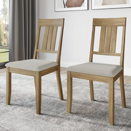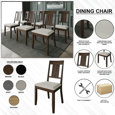 Discover elegance and endurance in our simple dining chairs. Crafted from sturdy wood, they assure stability and enduring comfort with high-density foam cushioning. Featuring a classic vertical backrest, these chairs add sophistication and back support. Available in Brown, Natural Oak, Black, White, and Grey finishes, they seamlessly fit any decor. Assembly is effortless with four tapered wood legs. Each order includes two chairs, merging elegance with practicality. Elevate your dining with timeless comfort. Product Dimensions in inches: Length: 19.70 x Width: 22.26 x Height: 38.61