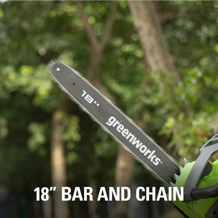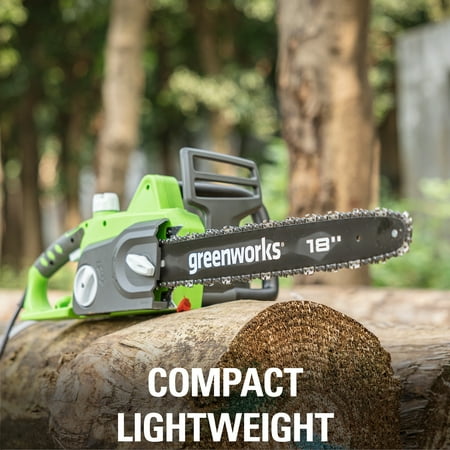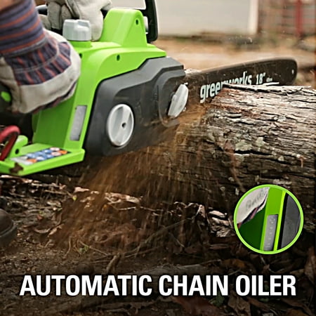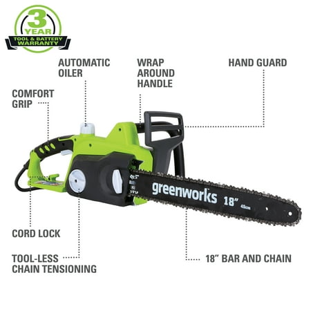 Greenworks 145 Amp 18" Corded Electric Chainsaw, 20332. The Greenworks 24V POWERALLâ„¢ lithium-ion platform powers 125+ indoor & outdoor products, including lawn mowers, blowers, string trimmers, chainsaws, power tools and more! Our 24V lithium-ion battery provides 20% more power and 35% more run-time, and delivers fade-free power with no memory loss after charging. The outdoor power equipment is ideal for tackling yards up to 1/3 acre. The Greenworks 24V POWERALL platform comes with a 3 Year Limited Tool & Battery Warranty to protect your investment. 10" bar and chain, perfect for cutting branches and limbs with ease. Tool-less chain tensioning for quick adjustments so you can get back to the task at hand.Automatic oiler applies oil to the bar and chain to ensure durability and extend the life of the chain.Hassle free push button start.Translucent oil tank for clear view of oil level.