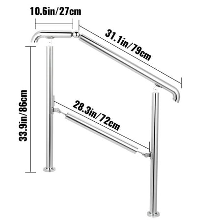 Brand Introduction VEVOR is a leading brand that specializes in equipment and tools. Along with thousands of motivated employees, VEVOR is dedicated to providing our customers with tough equipment & tools at incredibly low prices. Today, VEVOR has occupied markets of more than 200 countries with 10 million plus global members. Why Choose VEVOR? 1.Tough Quality Assurance 2.Incredibly Low Prices 3.Fast & Secure Delivery 4.30-Day Free Returns 5.24/7 Professional Customer Service Product Description2-3 Steps Stainless Steel Handrail Rugged Construction & High Stability & Mirror Finish Fit 2 to 3 Steps As a great helper for your family members to go up and down the stairs, this handrail for outdoor steps fits 2 to 3 steps. Besides, the railing provides high stability and reduces fatigue for you. Angle Adjustable With the flexible screws connection, this outdoor handrail is angle changeable within 0-45° to suit steps of different heights. Thus, you can adjust the desired location to meet your various needs. 441 lbs Load Capacity Our handrail for steps can bear up to 441 lbs/200 kg load. The tube is 0.05"/1.2 mm thick, uneasy to deform or flex. Also, the 0.12"/3 mm thickened base ensures super stability and firm support. 304 Stainless Steel This exterior railing for porch is constructed with sturdy 304 stainless steel, making it rust-proof and corrosion-proof. As a result, the bar can withstand years of exposure to all kinds of weather. Easy to Assemble The stair railing kit includes everything you need to attach the rail and post to the stairs. Pre-drilled holes on the base also eliminate your trouble of drilling. Thus, it only takes a few minutes to install. Versatile Uses Our stainless steel step railing is suitable for residential buildings, gardens, hotels, porches, and other places with stairs or steps. It serves as a support to improve security, comfort, and convenience. Specifications Model: BXG-3STEP Steps: 2 to 3 Material: 304 Stainless Steel Adjustable Angle: 0-45° Load Capacity: 441 lbs/200 kg Product Size (W x H): 41.7" x 33.9"/106 x 86 cm Distance Between Vertical Bars: 28.3"/72 cm Base Diameter: 3.3"/8.5 cm Tube Diameter: 2"/5.1 cm Tube Thickness: 0.05"/1.2 mm Base Thickness: 0.12"/3 mm Pre-Drilled Hole Diameter: 0.35"/9 mm Product Weight: 13.9 lbs/6.3 kg Color: Silve Package Content 1 x Stair Handrail 16 x M4*16 Screws 6 x M8*60 Expansion Bolts 4 x M6*12 Socket Head Cap Screws 1 x Allen Wrench 1 x Open-Ended Spanner 1 x Screwdriver