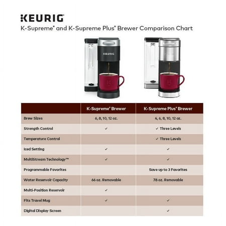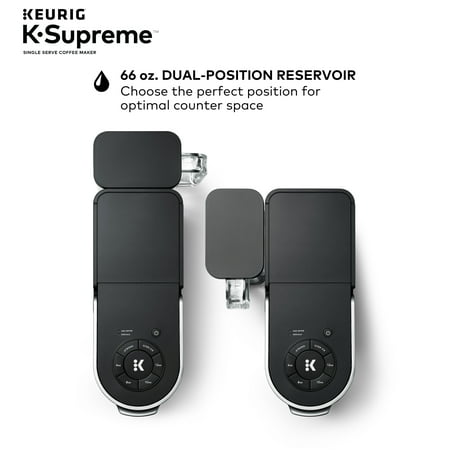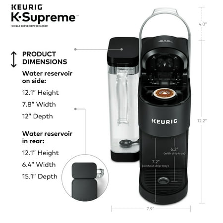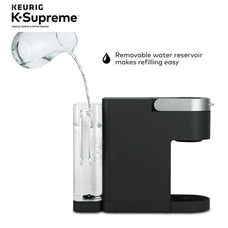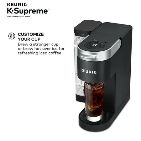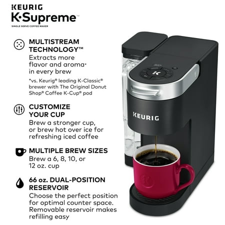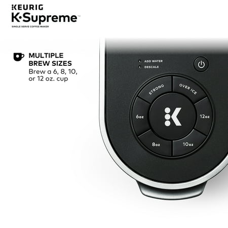 Elevate your everyday coffee experience to delicious new heights with the Keurig K-Supreme Single Serve coffee maker in Black. The K-Supreme coffee maker is the first series of Keurig brewer to feature MultiStream Technology, an innovative new way to more evenly saturate the coffee grounds* in every K-Cup pod. This technique extracts full flavor and aroma from your K-Cup pod, so you can enjoy an exceptionally flavorful experience every time you brew.Looking to customize your perfect cup? Use the Strong button for a stronger, more intense coffee taste or brew hot over ice for a refreshingly delicious iced coffee. No matter what you prefer, you can enjoy 6, 8, 10, or 12 oz. of your favorite coffee, tea, cocoa, and more – all freshly brewed in minutes. The K-Supreme coffee maker is travel mug-friendly, and the stylish 66 oz. dual-position reservoir makes it easy to refill and easy to find the perfect spot on your countertop.Choose from hundreds of delicious varieties of K-Cup pods or brew your own ground coffee with the My K-Cup Universal Reusable Coffee Filter (sold separately).*vs. Keurig leading K-Classic brewer