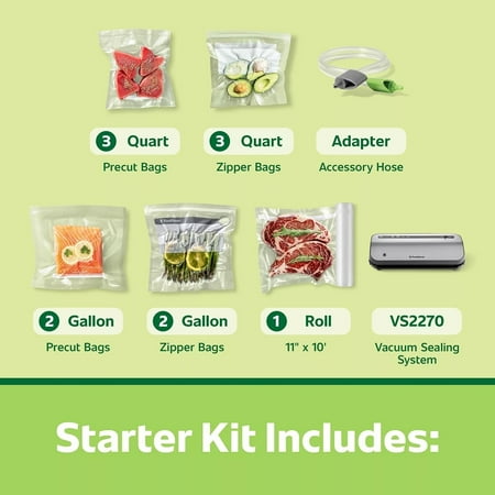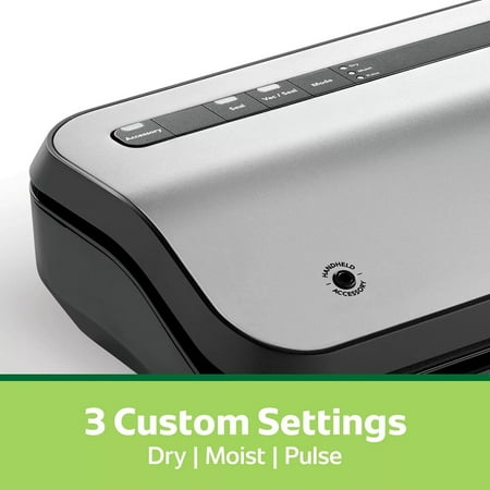 Keep food fresh up to 5x longer, than ordinary storage methods with the FoodSaver Preserve Vacuum Sealing System. This vacuum sealer machine uses innovative technologies to remove air and create an airtight seal, helping to prevent freezer burn, preserve freshness, and save you money. Choose from 3 different modes for vacuum sealing versatility: Dry or Moist mode for different food types, and Pulse mode for sealing delicate foods. This vacuum sealer features built-in roll storage and a cutter bar so you can easily create custom-size bags, while the built-in bag alignment, plus an extra wide sealing strip, perfectly positions bags to help cut down on bag waste. Two easy ways to use it: select the Vac/Seal mode to remove air and create an airtight seal, or select Seal mode to simply create an airtight seal. Connect the included accessory hose and adaptor to the accessory port, to vacuum seal with additional FoodSaver accessories. The fingerprint-resistant lid helps to keep your vacuum sealer looking like new, while the assortment of included bags and rolls allow you to start vacuum sealing right away! Stretch your grocery dollars further with a FoodSaver Vacuum Sealer, and get the most out of your food today.