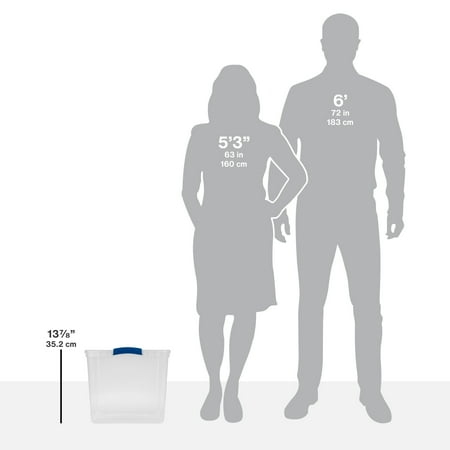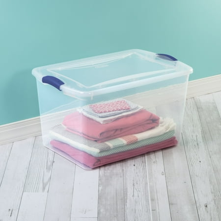 Step up to Sterilite’s versatile 66 Quart Clear Latching Storage Bin and get organized! The clear base and lid let you easily view and locate stored contents from any angle. The color accent latches keep the lid attached to the base, to keep items contained. The recessed lids help bins stack neatly for efficient use of vertical space. This popular size plastic storage container is perfect for clothing, blankets, boots, off-season gear, and bulky items. This is the ideal solution for a variety of storage challenges, helping to bring order to closets, bedrooms, craft rooms, and dorms!