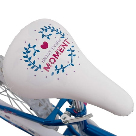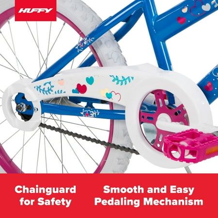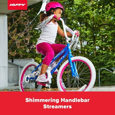 Huffy Sea Star Kids Bike, 20" Wheels, Ages 5-12 Years, Streamers, Blue/Pink The 20-inch Girls' Huffy Sea Star Bike with Huffy EZ Build offers fun and style for young riders. Its metallic frame in eye-catching blue and pink features heart-shaped accents along the partially enclosed chainguard, giving it a charming look. The durable steel frame and hot pink wheel rims add to its appeal, while the padded seat and coordinating crossbar pad provide comfort. With Huffy's EZ Build, assembly is quick and tool-free, so your child can start riding in no time. This single-speed bike includes an easy-to-use coaster brake for safe stops, and the alloy quick-release lever allows for easy seat adjustments. The sparkly streamers add extra flair as they flutter in the wind, making every ride more enjoyable. Designed for both style and comfort, this bike ensures hours of outdoor fun and adventure for your little one. From Huffy, We Make Fun!