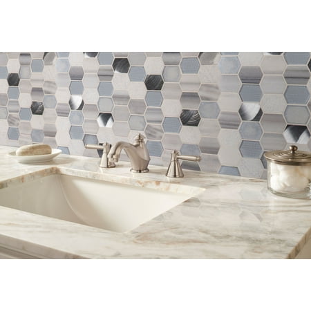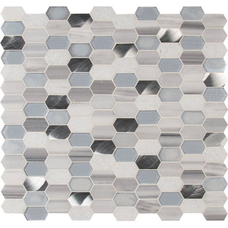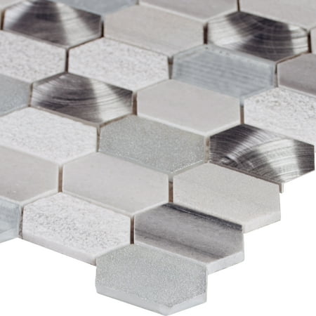 The Harlow Picket Mosaic Tile is a stylish mix of glass, metal, and stone pieces in different colors. It comes in a mesh-mounted sheet of 11-1/2 inches by 12.4 inches. This variety of tile textures and finishes gives a modern and distinctive look to any space, whether it's a home or a business. These tiles can be used indoors or outdoors, including on fireplaces. They're especially eye-catching when used as a kitchen backsplash or shower wall and can also be a beautiful feature on countertops or as decorative panels.