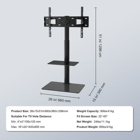 Product Description 65-inch Universal TV Stand The 0.4" thick tempered glass is stable and compression-resistant. With a non-suspension design, it will not damage the wall and can be easily moved to other spaces. The adjustable height can meet your different needs. Supports 30° rotation, suitable for multi-angle viewing in the living room, bedroom, or kitchen. Elevate your viewing experience with BENTISM! Safety and Stability Our TV stand has been carefully designed to provide max safety and stability, ensuring your TV won't shake or tip over. With its 0.4" thick tempered glass base, it can support a max weight of 90lbs and accommodate TVs up to 65 inches in size. Easy Adjustment Featuring a 6-level adjustable height and ± 30° rotation, the TV stand with mount easily adapts to different viewing angles without requiring you to move the entire unit, making it more convenient than ever before! Assemble in Minutes The swivel TV stand can be assembled in just 10 minutes without drilling, which can better protect your walls. Its freestanding design makes it easy to move to any room. Cable Management System The back of the floor TV stand is equipped with cable management to keep messy wires tidy, which prevents tripping hazards, providing a neat and organized look. Universal Design The TV stand mount is compatible with VESA ranging from as small as 4x4in/100x100 mm to as large as 16x24in/400x600 mm, fitting 32-65 inch TVs. Versatile Compatibility The height-adjustable and mobile design makes it perfect for living rooms, bedrooms, and patios, as well as for conferences and business presentations, providing a better viewing experience. Specifications Product Size: 26x15x51in/660x380x1296 mm Weight Capacity: 90lbs/41kg Suitable For TV Hole Distance: Min: 4"x4"/100x100 mm, Max: 16"x24"/400x600 mm Adjustable Height: 46-51 in/1175-1296 mm Fit Screen Size: 32"-65" Net Weight: 24 lbs/11.1 kg Package Content 1 x TV Stand
