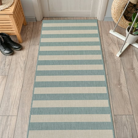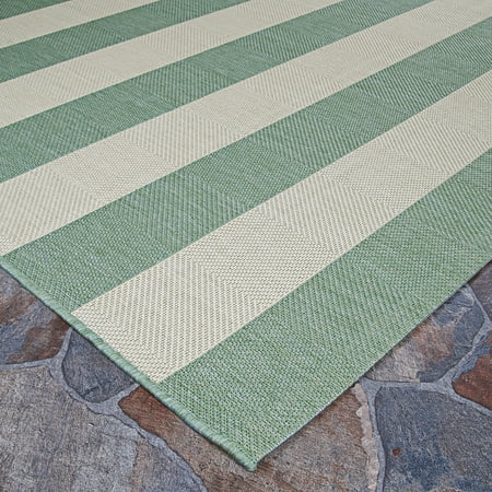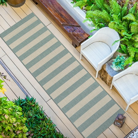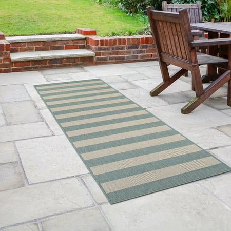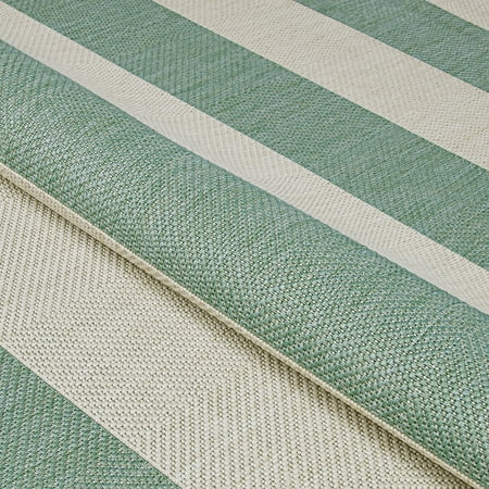 Couristan's Afuera Yacht Club collection of all-weather indoor/outdoor rugs is a perfect addition to any home. These area rugs feature an attractive nautical-inspired design with alternating sea mist and ivory color bands, creating a casual yet chic vibe. Power-loomed from 100% fiber-enhanced Courtron polypropylene, these floor coverings are highly durable and comfortable underfoot. They are also UV stabilized for retaining color. Plus, they’re mold and mildew resistant and easy to clean — making them ideal for households with kids or pets. The versatile style of the Yacht Club collection looks great indoors or out. Outdoors, spruce up your patio, sunroom, deck, or pool area. Indoors they look fantastic in entryways, hallways, living rooms, laundry rooms, and more!