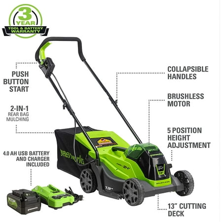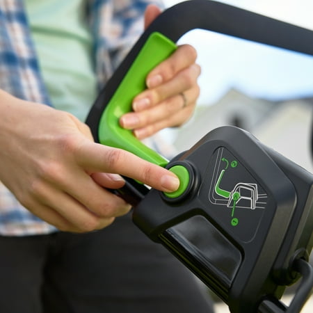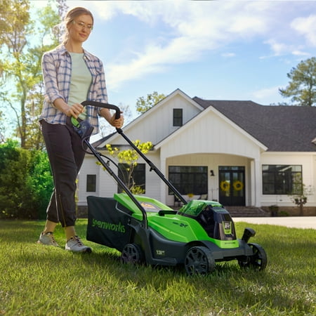 Powerfully smart. Tackle the toughest yards, one-handed, because our smart mowers never bog down. When grass gets thick, tall, or wet, Greenworks sensors tell our brushless motor to rush power to the mower blades. The end result? The perfect lawn, every time. Powerfully tough. The mower features a lightweight yet durable poly deck, weighing less than 21 lbs. Add in algorithms and a brushless motor to reach unrivaled blade speed. Ka-pow! Powerfully easy. Simple to start with just the push of a button. Lightweight, portable, and easy to maneuver. Gentle on the ears because it mows quietly. A cinch to store in small spaces, you can even hang it up if you want to. Zero gas smell. Zero pull cords. Zero maintenance. Zero pollution breathed. Zero time wasted. Does this Greenworks mower run off of one battery? Yes, this mower runs off of one battery. The use of a singular battery in this Greenworks mower contributes to a user-friendly experience, providing consistent and reliable power for a seamless lawn care routine.